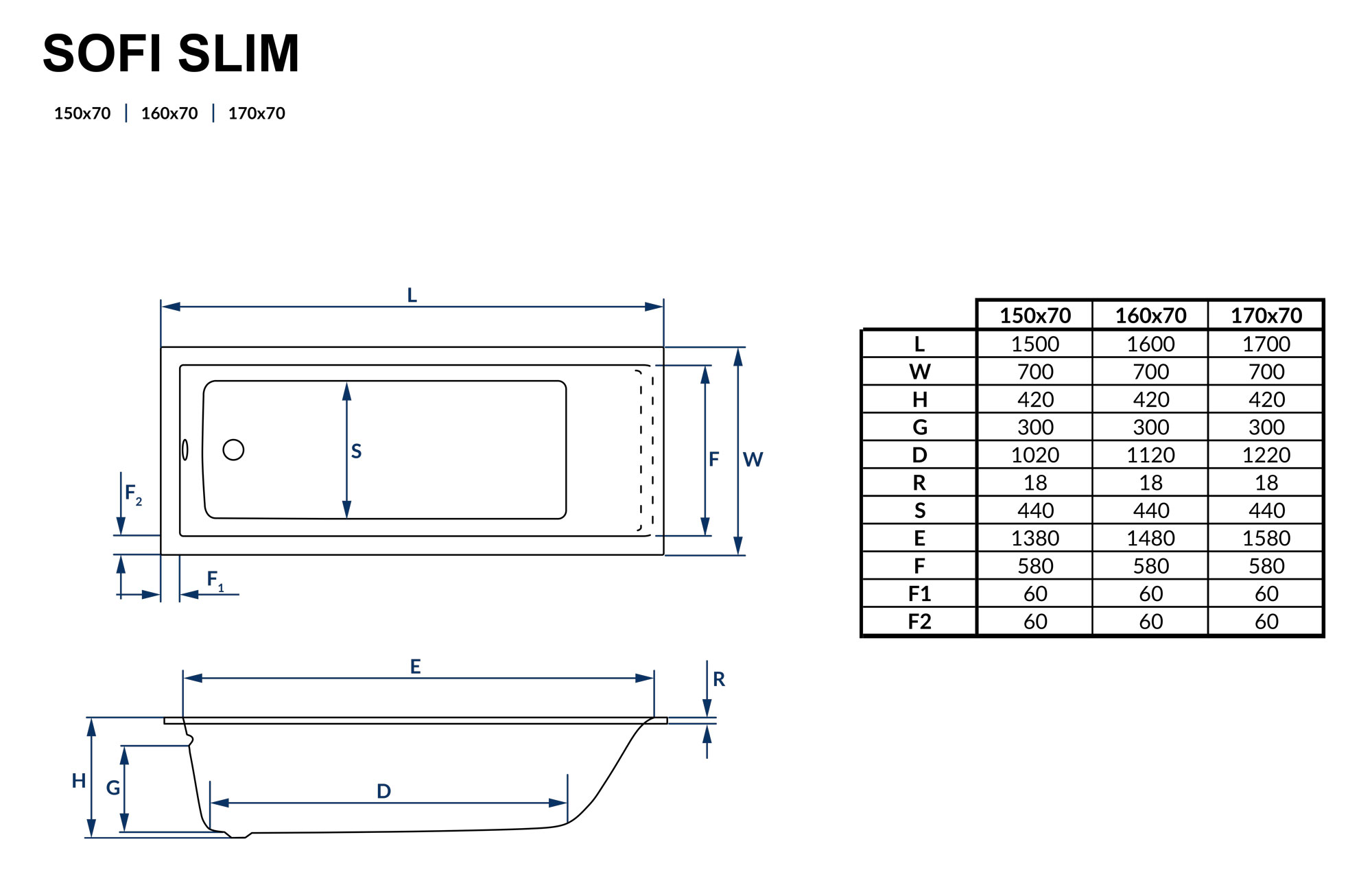 A Niwell Luxury Sofi slim egyenes kád modern, letisztult formájával és 18 mm vékony slim peremével tökéletes választás a stílusos fürdőszoba kialakításához. Három méretben érhető el (150×70 cm, 160×70 cm, 170×70 cm), így kis és nagyobb terekbe is ideálisan illeszkedik.